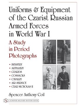 Russian Armed Forces in World War I Spencer Coil examines the uniforms and equipment used by the multiethnic Czarist Russian Forces during the turbulent reign of Czar Nicholas II. In addition to a remarkable selection of studio photos, stunning candid photos of front-oviki, or frontline troops, offer an authentic view of trench and battlefield life. Each photo has been carefully chosen and researched to offer the reader detailed information on the medical, motor, naval and air service branches as well as artillery, machinegun, pioneer, infantry, cavalry, and guard troops. There are chapters covering Cossacks, Caucasian irregulars, POWs, St. George Cross recipients and Czar Nicholas II. A full color section of heretofore unpublished photos of original headdress, equipment and accessories used by the armed forces provides valuable information on materials, markings, stamps and construction. This work is an outstanding and indispensable resource for all historians, collectors, re-enactors, war gamers, model builders and Czarist Russia enthusiasts. 9 X 12, 384 pages, over 600 b/w and color photographs. $69.95 |