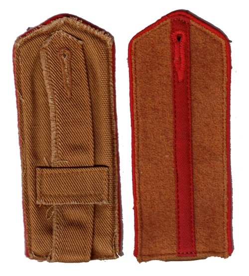 RSECK2.Cossack, Russian and Ukrainian Armies of liberation junior officer shoulder boards on Tan fabric with Red piping and 1cm Red center stripe. Shoulder boards are 5.5cm wide x 13.5cm at center. $20.00pr |