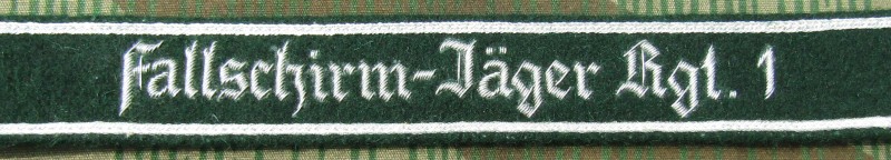RSE122.Fallschirm-Jager Rgt 1 officer cufftitle. Hand embroidered aluminum on Dark Green with Russia-braid edging. $19.95 |