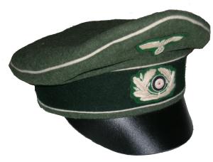 Field gray wool body with Green piping, leather visor, bevo silver cap eagle and cocarde. |