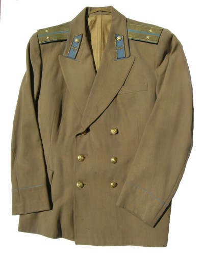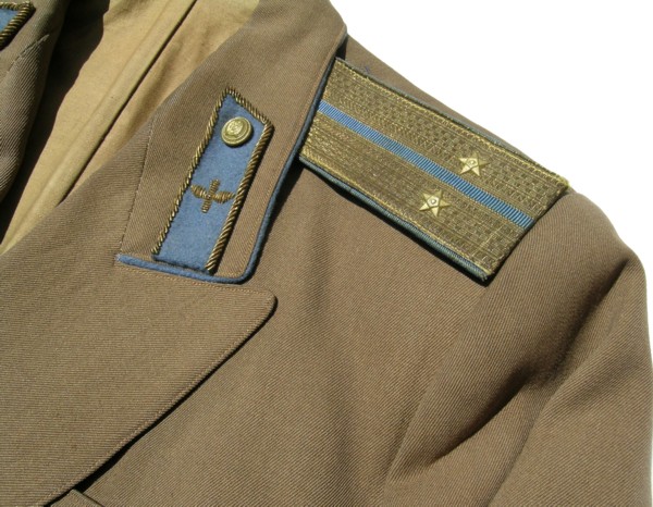 tunic dated 1952.Hungarian made,Soviet style shoulder boards,collar tabs have embroidered gold bullion winged propeller on blue felt with gold bullion border.Tunic is brown open collar,double breasted with gold buttons with communist crest. Rare early tunic. |