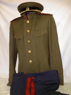 everyday uniform. Complete with jacket,breeches,and visor.Jacket has purple piping around cuffs and collar,gold embroidered leaves on collar.Breeches have purple generals stripes.Shoulder boards have embroidered marshal star and embroidered Signals device. Size 58-4. $950.00 |