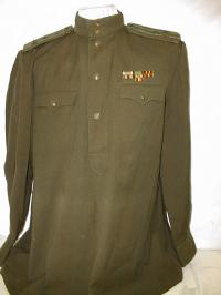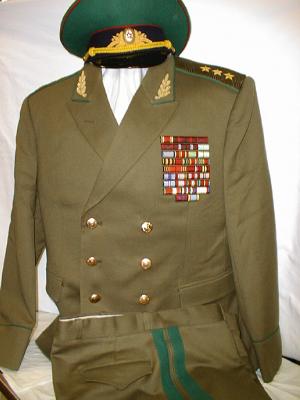everyday uniform. Jacket,breeches,visor.Jacket has red piping around cuffs and collar, gold embroidered leaves on collar.Large ribbon bar including ribbons for 2 Orders of Lenin.Breeches have red general stripes.Visor has red piping and gold embroidered wreath around Generals kokarde.This rank was used from March 1958 to 1973. About size 58-4.$800.00 |