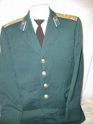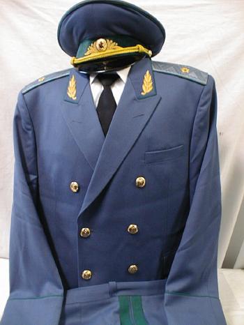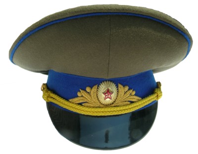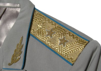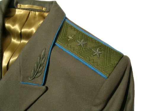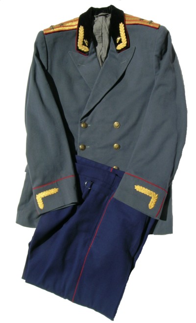 everyday uniform. Complete with jacket,pants,and visor.Jacket has light blue piping and gold embroiderd leaves on collar.Pants have light blue generals stripes.Shoulder boards have embroidered marshal star with gold embroidered wreath and embroidered winged propeller.Size 56-4.$950.00 |
