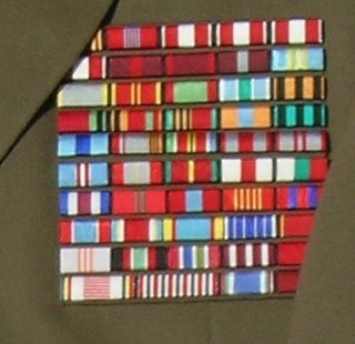 on each sleeve,large ribbon bar.With White pants and visor.