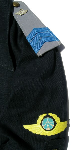 service uniform (jacket, breeches, visor). Jacket is open collar with blue piping around collar and cuffs, subdued plastic buttons, green thread embroidery on collar, large ribbon bar. Shoulder boards are olive wth 1 large embroidered star with blue outline and embroidered winged propeller in green thread. Breeches are olive with blue stripes.General visor is olive color with olive bill and olive chincord, and subdued generals cocarde. About size 58-4. $850.00 |