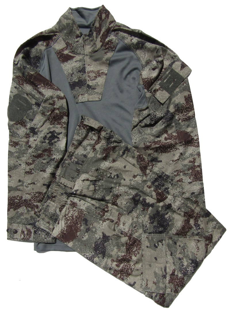 CH44.Chinese Army Winter Desert Geometry Camouflage Uniform. Jacket is zip up with snap closure and has 2 upper pockets, 2 lower pockets, 1 sleeve pocket. Pants have 2 front pockets, 2 cargo pockets. $99.95