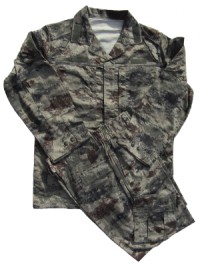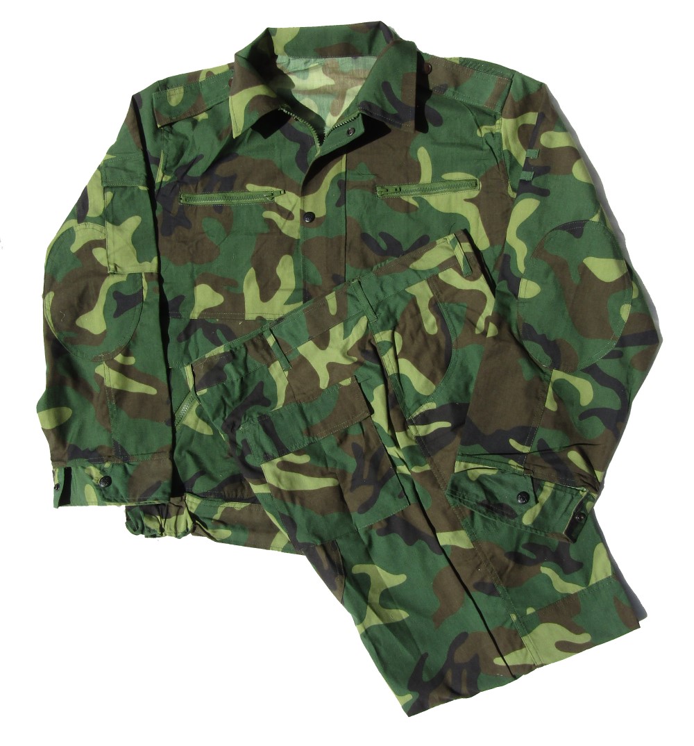 CH29.Chinese Army Type 07 Woodland Camouflage Uniform. Jacket is hidden button front and has 2 upper pockets, 2 lower pockets, 1 sleeve pocket. Pants have 2 front pockets, 2 cargo pockets. $89.95