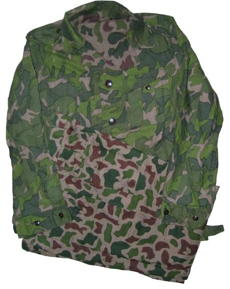 CH49. Chinese Marines Type 97 blue/green camouflage sets. Jacket and pants. Soldiers model.Jackets are zip up with snap closure,2 upper horizontal zipper pockets,2 lower open vertical pockets,1 sleeve pocket.Pants have 2 front pockets. $99.95