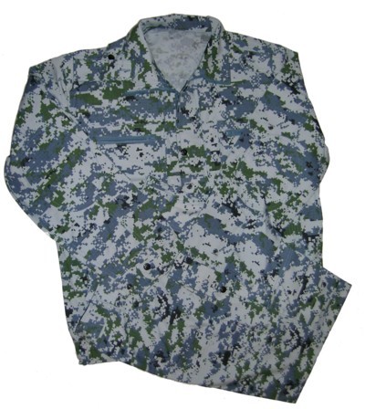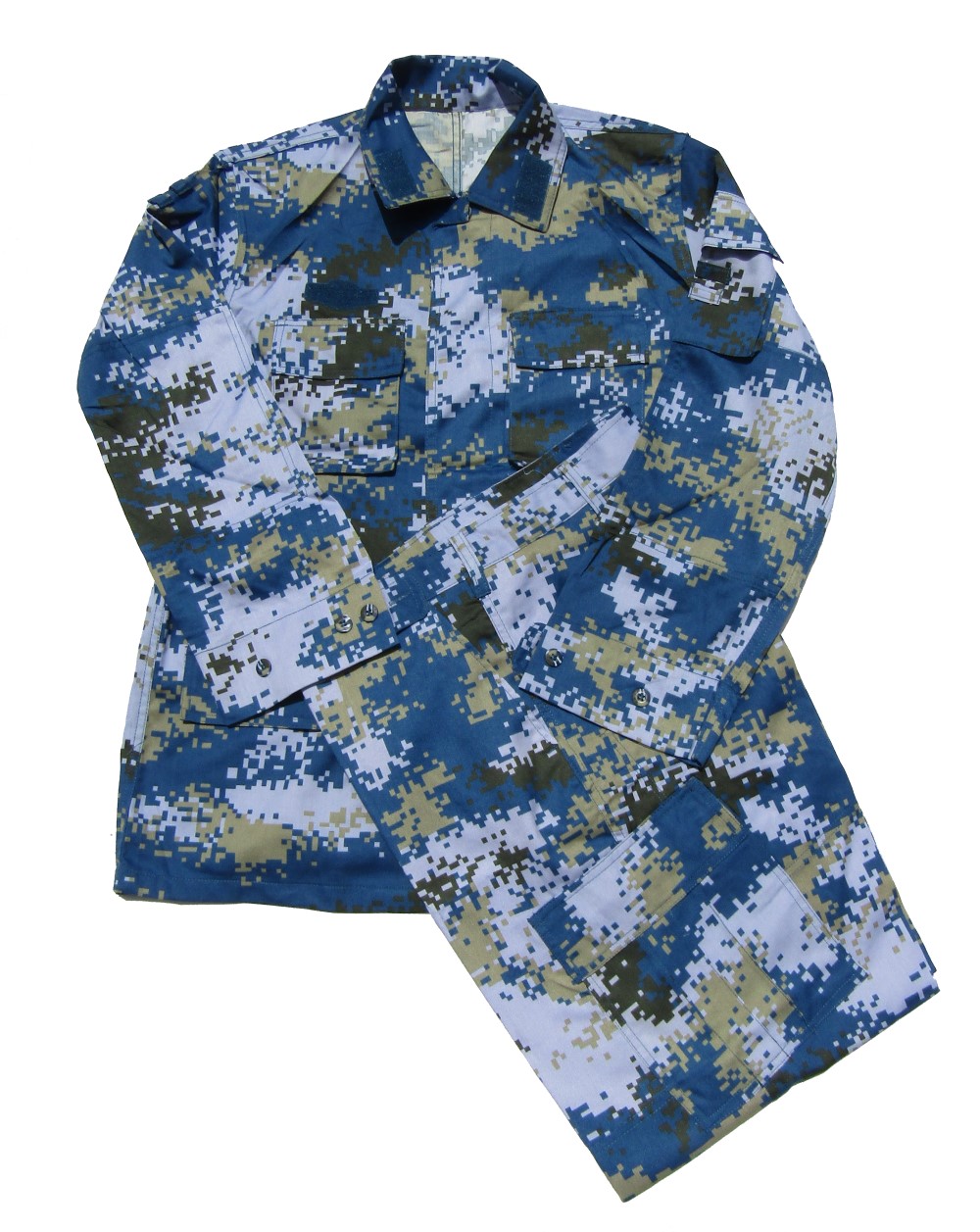 CH35.Chinese Navy Type 07 Blue Camouflage Uniform. Jacket is hidden button front and has 2 upper pockets, 2 lower pockets, 1 sleeve pocket. Pants have 2 front pockets, 2 cargo pockets. $99.95