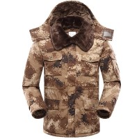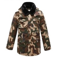 CH37. Chinese Type 21 Desert Starry Sky camouflage winter jacket. Jacket is zip up with button front, 2 upper pockets, 2 lower pockets, 1 sleeve pocket. Removable zip in liner, removable hood. $199.95