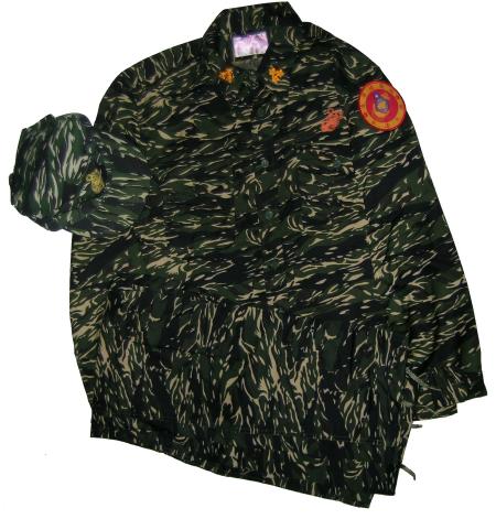 camouflage with insignia. Shirt,pants,hat, web belt with gold buckle with marine emblem. $150.00 |