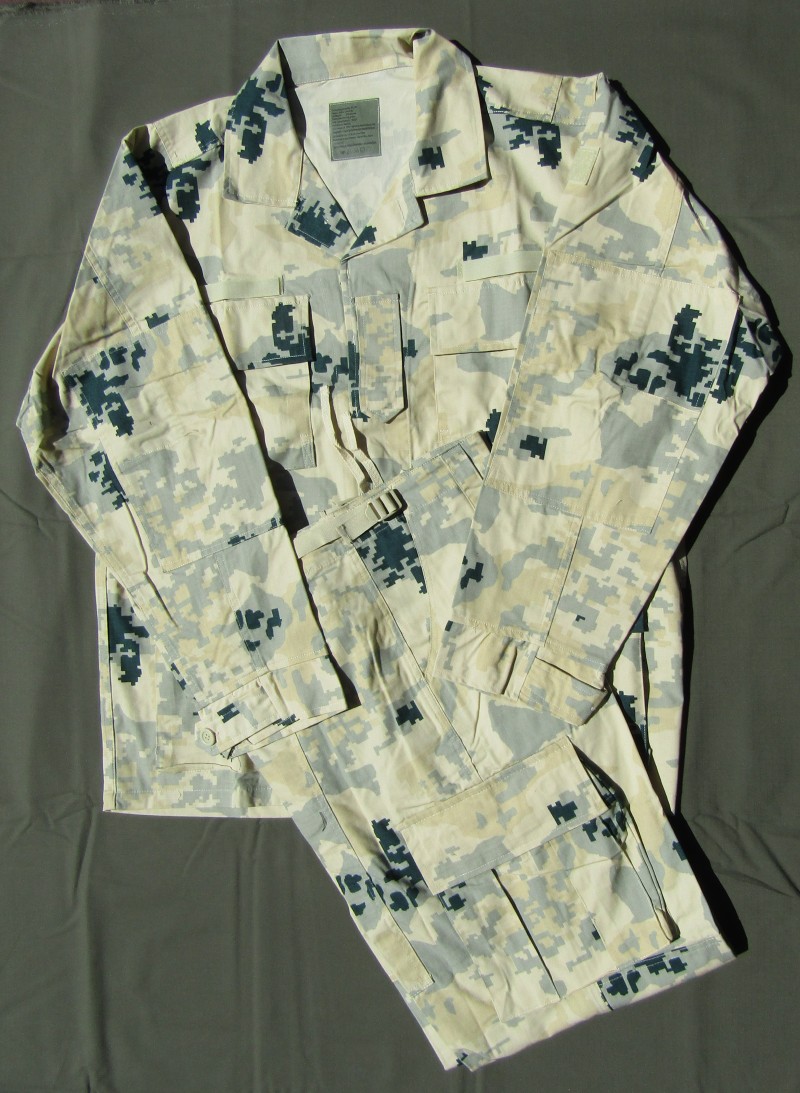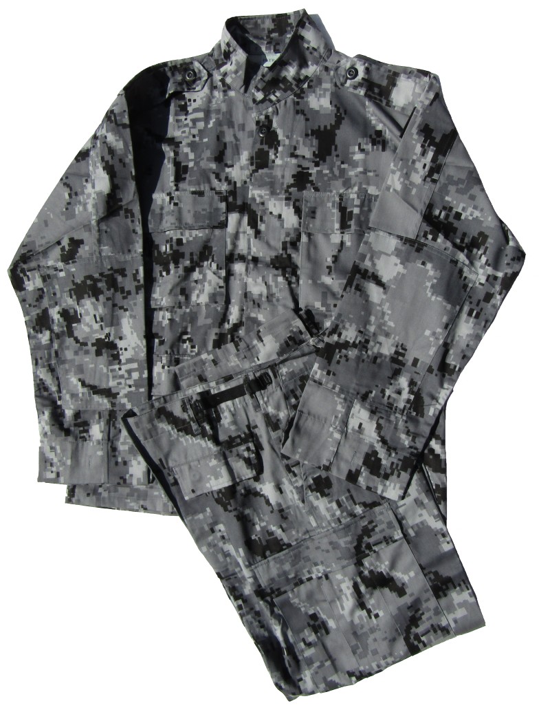 ME3. Digital Urban camouflage set. Shirt is zip up with velcro closure, Collar has pull tab, 2 upper zip close slant pockets , 2 sleeve zipper pockets. Pants are zip up with button top and have 2 front pockets, 2 zipper close back pockets, 2 zipper close cargo pockets. Maker marked Jungle Front. 100% cotton ripstop. Available in sizes XXL, and XXXL. $119.95 |