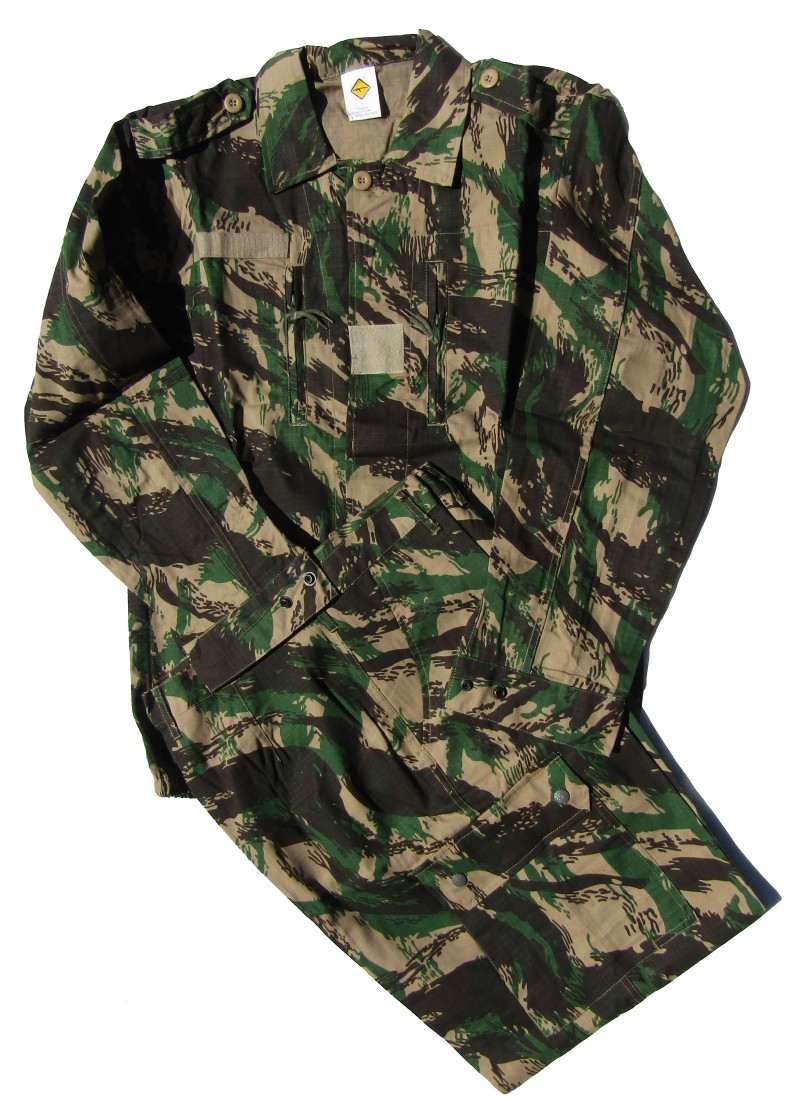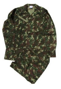 ZIM1.Zimbabwe Portugese pattern camouflage set. Shirt has 2 upper pockets. Pants have 3 front pockets, 2 cargo pockets. Shirt size 16, pants size 32. unissued. $150.00 |