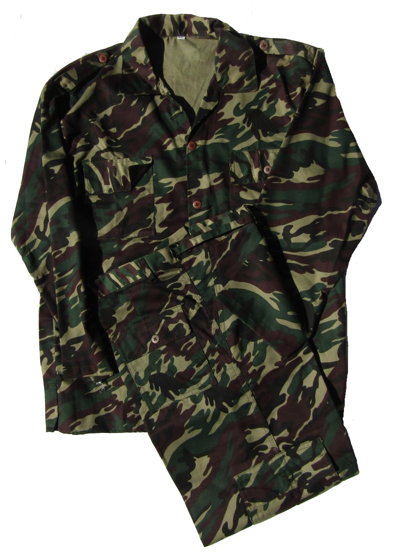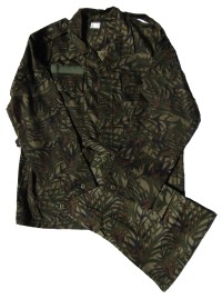 AN1. Angolan Army Leaf pattern camouflage sets. Shirt is button up with 2 front vertical zipper pockets , 2 lower patch pockets. Pants are zip up with 2 front pockets, 2 cargo pockets. Fabric is a twill material. Available in sizes Large and XL . SOLD OUT |