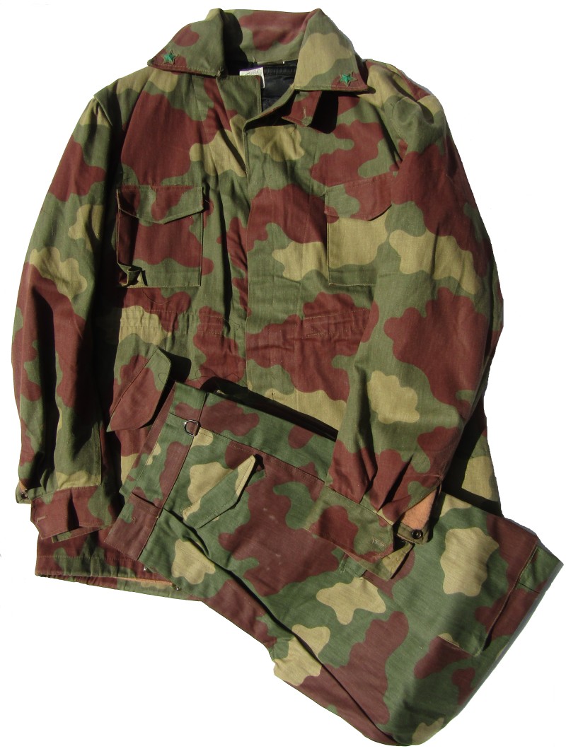 IT3.Italian Comsubin camouflage uniform. Jacket has 2 upper and 2 lower pockets, 1 sleeve pocket. Removable button in lining. Pants have 2 front pockets, 2 back pockets, 2 cargo pockets.Unissued. Pants are about a 40 inch waist, jacket about a 46-48 inch chest size. $350.00 |