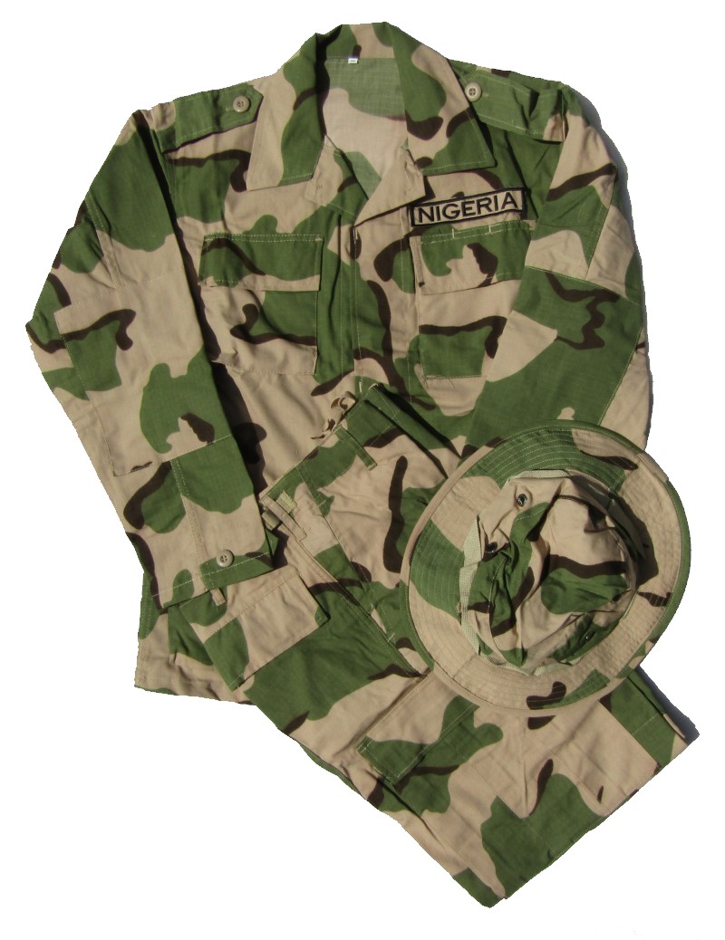 NIGERIA1.Nigerian Army camouflage BDU set size medium Jacket has 2 upper and 2 lower pockets, pants have 2 front pockets, 2 back pockets, 2 cargo pockets jacket measures 21 inches from armpit to armpit, pants are about a us 30 inch waist hat size is about a 58 $129.95 |